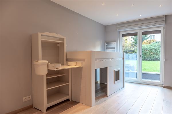L’appartement offre deux chambres lumineuses, chacune dotée de grandes fenêtres donnant accès à une terrasse avec vue sur le jardin commun, véritable havre de paix dans ce quartier calme. La salle de bains, élégamment aménagée, dispose d’une douche à l’italienne, d’une baignoire et de rangements intégrés, alliant confort et praticité.