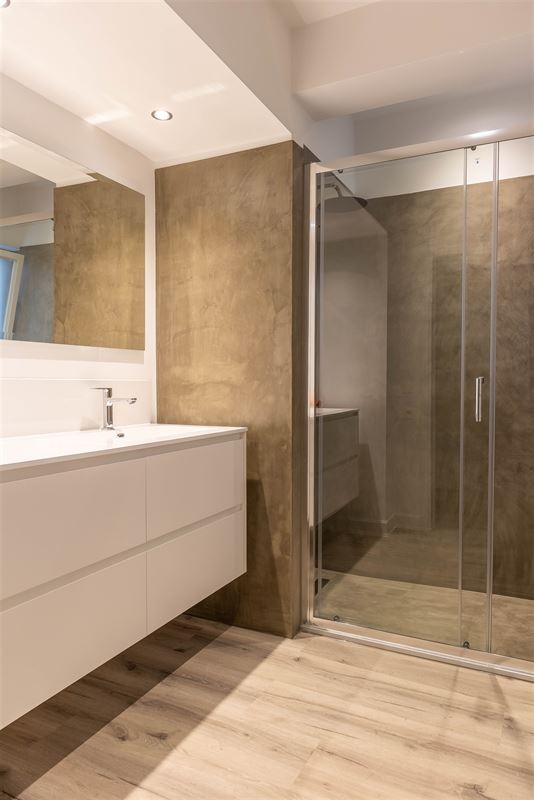 L’appartement se compose d’un vaste hall d’entrée avec vestiaire et WC invités, d’un lumineux séjour donnant accès à une terrasse orientée sud-ouest, d’une cuisine super équipée, d’un hall de nuit avec WC séparé, de deux chambres, d’une salle de douches et d’une cave.